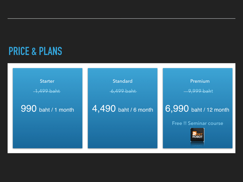 SetRobot is a Thailand’s Market Trading application for traders to analyze the markets. It uses technical analysis to help traders take the guesswork out of trading by offering a methodical, systematic approach to selecting which securities to trade and when.